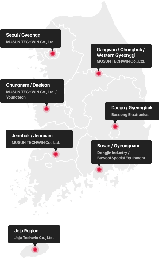 | Chungnam / Chungbuk / Daejeon | MUSUN TECHWIN Co., Ltd. | Headquarters 031-401-2002 |